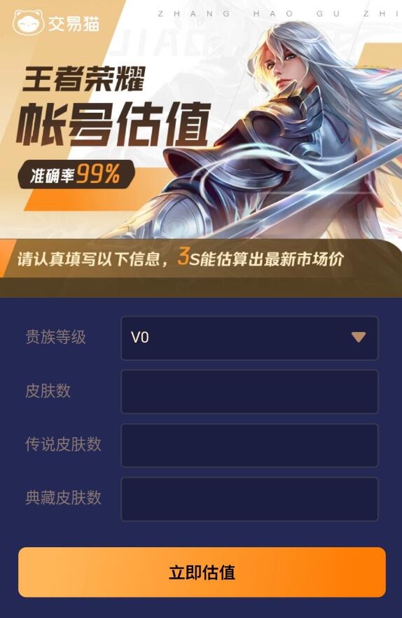 1.大多數(shù)玩家平時(shí)只關(guān)注游戲相關(guān)的資訊和操作技巧,對(duì)賬號(hào)的市場(chǎng)價(jià)格并不清楚,所以在出號(hào)的時(shí)候,就不知道該如何去定價(jià),為了方便大家賣號(hào),平臺(tái)專門打造了一個(gè)免費(fèi)估價(jià)功能,就以王者為例,大家只需輸入貴族等級(jí)、皮膚數(shù)量、傳說(shuō)皮膚數(shù)量以及典藏皮膚數(shù)量,接著點(diǎn)一下立即估值就能查到自己賬號(hào)的實(shí)時(shí)價(jià)格了。這個(gè)服務(wù)當(dāng)前僅適用于個(gè)別游戲,后續(xù)平臺(tái)會(huì)適配更多游戲。