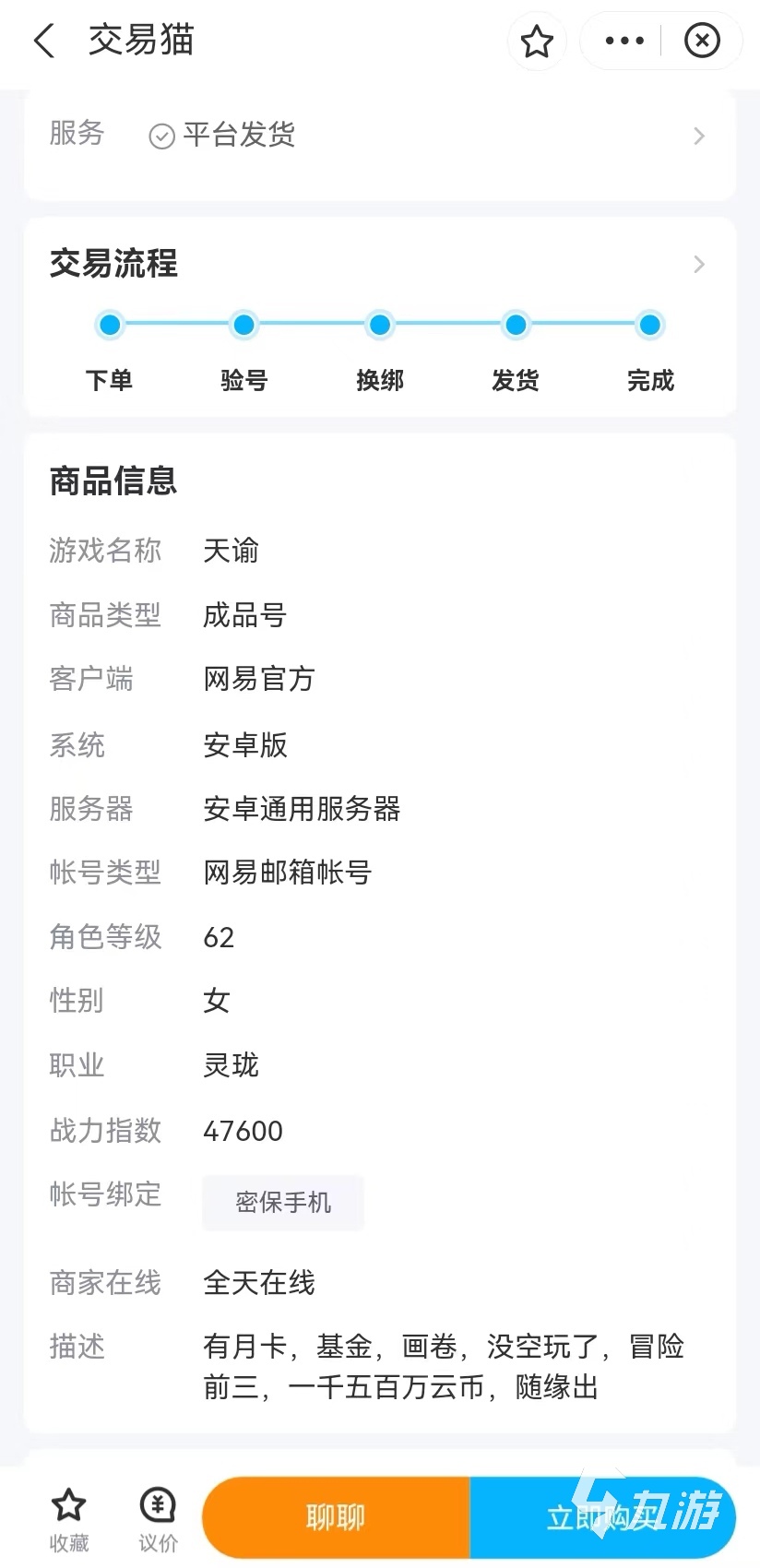 如果大家也想購買一個(gè)賬號的話,就不妨去試試交易貓這個(gè)游戲交易平臺,相信大家在使用過后一定不會(huì)失望的,接下來就讓小編為大家介紹一下這個(gè)平臺的特點(diǎn)吧!