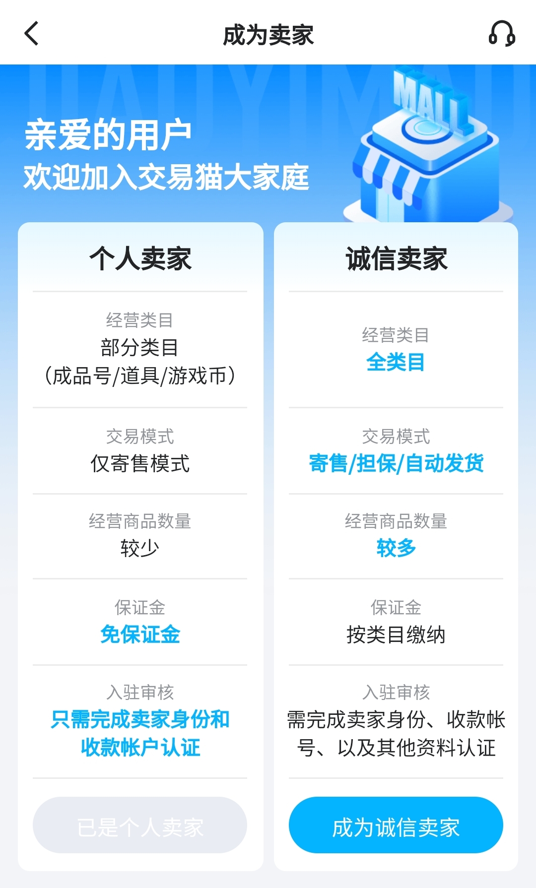 賣家可自主選擇成為“個人賣家”還是“誠信賣家”,前者無需繳納保證金,后者需要保證金和進一步的資料提交驗證,同時經(jīng)營類目更多、交易模式更多樣、經(jīng)營商品數(shù)量更多、更具信任度,不過小編覺得,大家偶爾賣個號,選擇個人賣家就行。