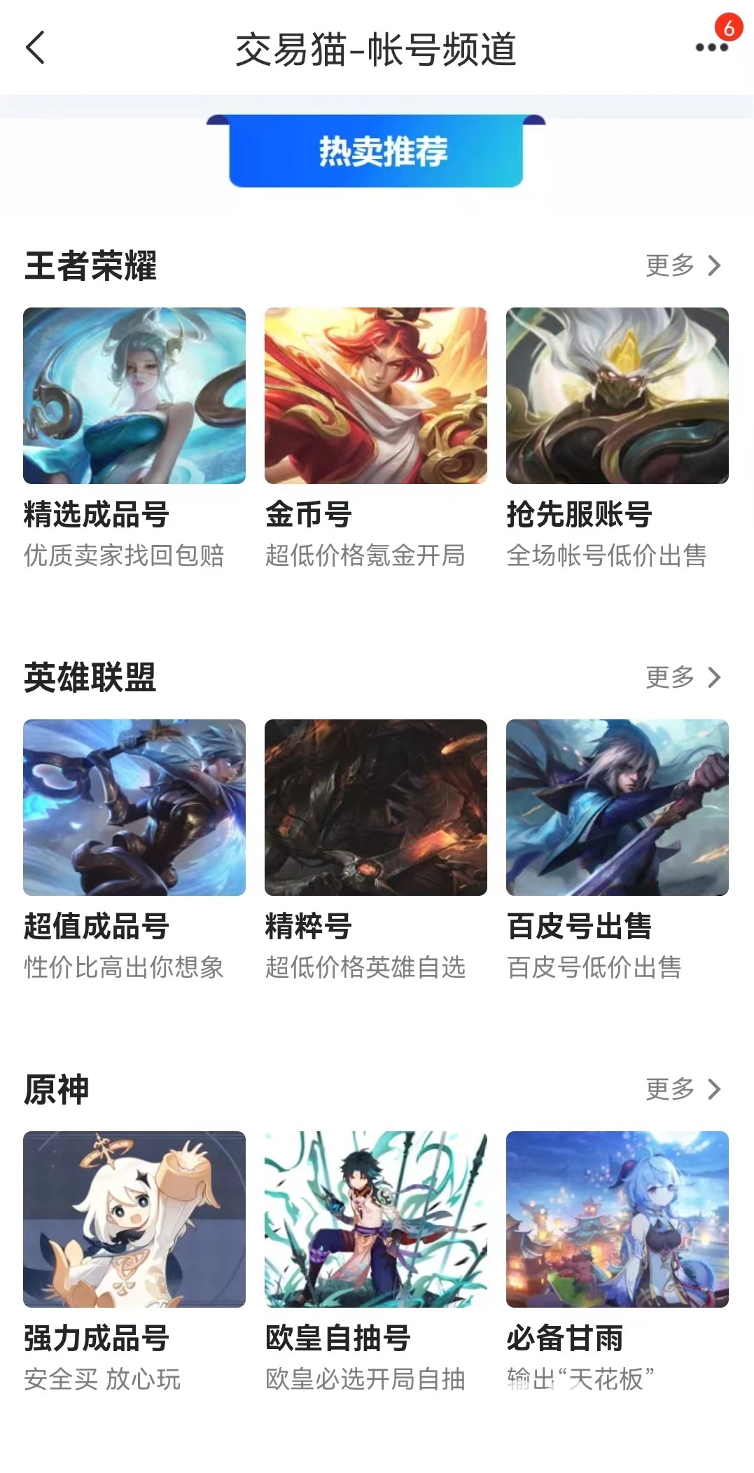 交易貓中擁有非常齊全的賬號種類,不僅僅體現(xiàn)在游戲?qū)^(qū)多,同一款游戲也提供了不同的賬號買賣服務。除了最常見的成品號交易外,還有大量的開局號、自抽號、首沖號等這些特殊的賬號,能夠滿足很多玩家的需求。如果不想購買別人的成品號,自己選擇一個開局號或首充號也可以愉快的開始游戲。尤其是對一些搜集或卡牌類型的游戲,一個完美的開局號就可以解決很多問題。