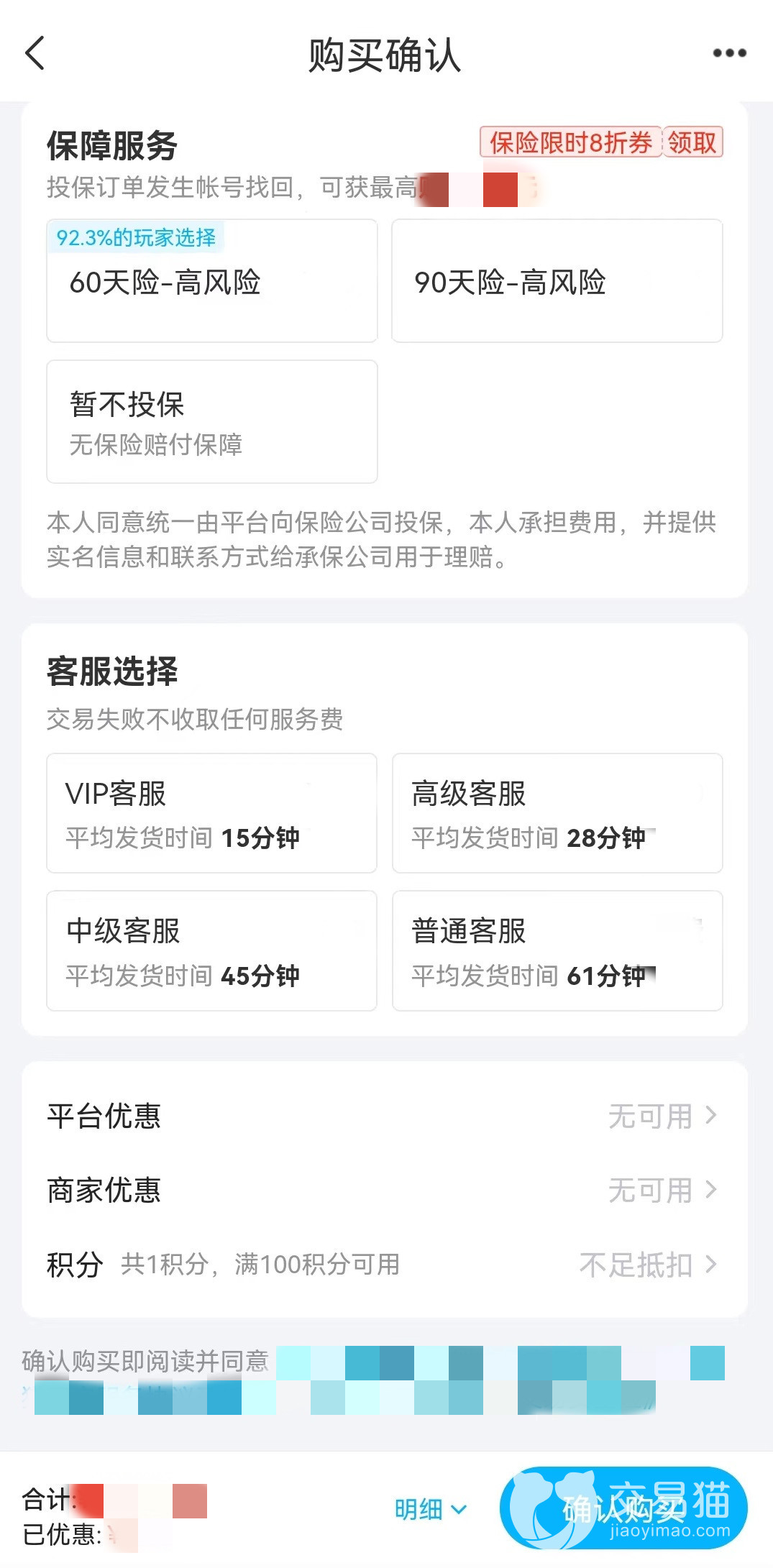 賬號保險是交易貓非常貼心的一項服務,也是維護賬號買家權(quán)益的最后一道防線,在賬號上架時就可以由賣家選擇直接購買賬號保險,如果賣家未購買,買家可以自行選購。賬號保險的作用就是在購買賬號后的一定時間內(nèi),如果出現(xiàn)被找回、封號或者盜號的情況,保險會給予經(jīng)濟補償最高可以全額退還。