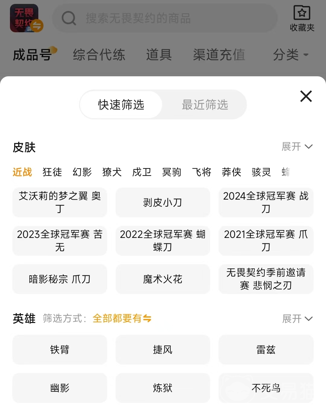 交易貓這個交易平臺,其上有足夠多的用戶和賬號相關的瀏覽量,基于這點有賣號需求的用戶也會在第一時間想起這個平臺,選擇上架在這個平臺上,因為比較好交易。買號時直接在平臺上搜索這個游戲,能擁有很多的商品列表,不知道怎么選的話,點擊【篩選】功能,可以對這些賬號的英雄、皮膚數(shù)量進行篩選,幫你進一步縮小符合要求的賬號商品內容。