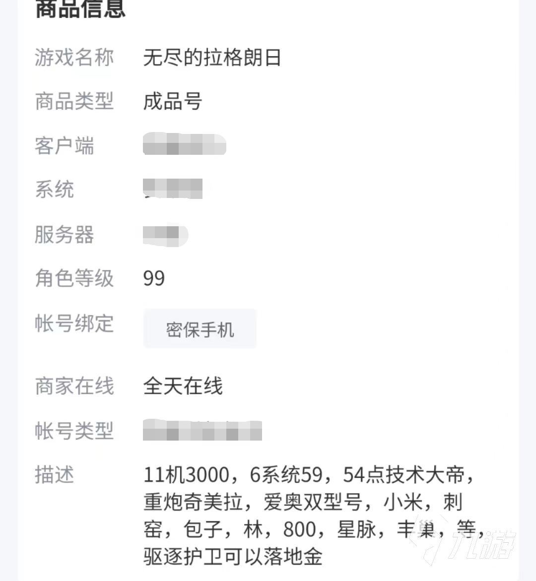 2、賬號內容介紹詳細。為了節(jié)省買家的時間,每個賬號下方都會有詳情介紹,就比如無盡的拉格朗日賬號一樣,號里面有什么戰(zhàn)艦以及等級、資源都寫的非常清除,買家還可以直接根據關鍵詞搜索所需要的賬號,快速定位到自己想要的產品,且信息都是真實有效的,不會出現虛標的情況。