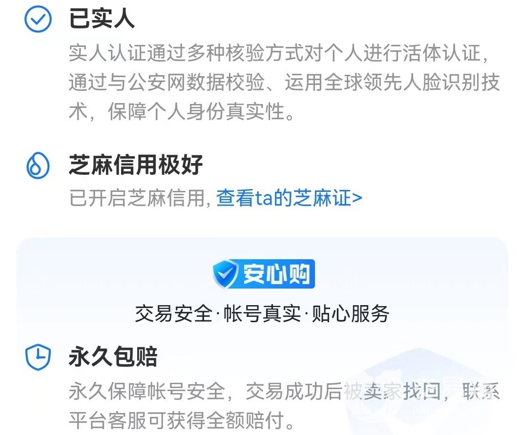 即使購(gòu)買的小號(hào)價(jià)值不高,但是在安全方面依然不能放松平臺(tái),提供了很多措施,例如對(duì)出售者進(jìn)行實(shí)人質(zhì)認(rèn)證和芝麻信用綁定,以及安心購(gòu)系列服務(wù)等。只要有這些措施,就不用擔(dān)心到手之后再出現(xiàn)安全問(wèn)題。