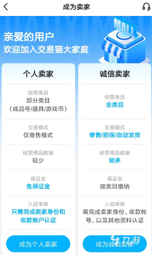 3、如果有玩家想在交易貓app當中大量的出售各類商品,那么即可在app內(nèi)直接申請成為一個合格的誠信賣家。有了賣家的資格以后,大家不僅可以發(fā)布所有類型的商品,還可以在大量活躍用戶的基礎(chǔ)上,讓商品的曝光率更好。