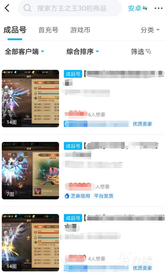 1、進入到萬王之王3d的交易專區(qū)之中,大家就能夠找到大量關(guān)于成品號、首充號、游戲幣等等交易信息。對于打算購買賬號的玩家,可以直接在其中去尋找自己最感興趣的商品。同時,玩家們也可以利用分類或者篩選功能,來進一步過濾掉自己不感興趣的商品類型。