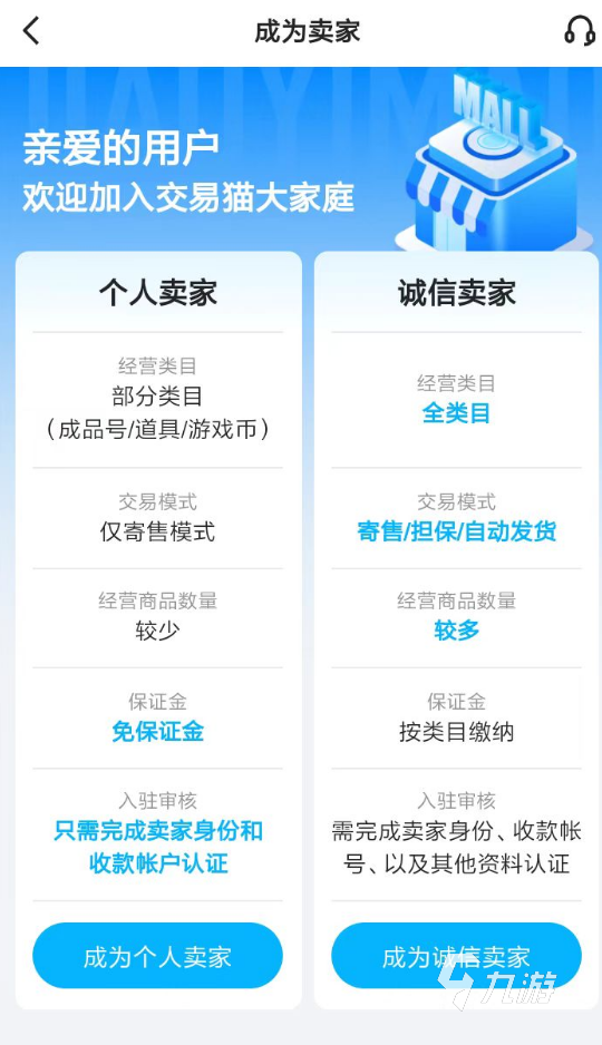 1、目前的平臺(tái)內(nèi),直接為每一個(gè)新加入交易貓的用戶提供了兩個(gè)不同的賣家身份。個(gè)人賣家可以隨時(shí)出售包含游戲號(hào)在內(nèi)的基礎(chǔ)商品,對(duì)于只打算出售賬號(hào)的玩家來說,認(rèn)證一個(gè)該身份會(huì)更方便。而誠(chéng)信賣家則有著較高的門檻,支持更豐富的商品類型,可以同時(shí)上架更多的交易信息。