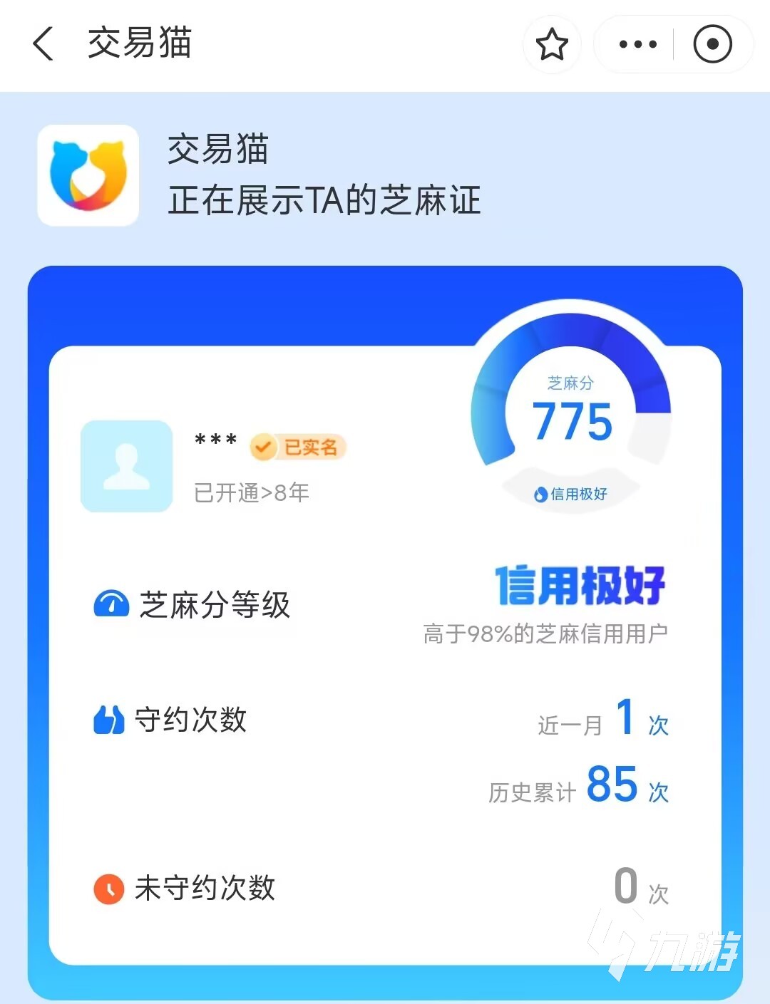 2.其次,對于很多人來說,在交易時最害怕的就是遇到一些沒有信譽或者是不守約定的玩家,這種玩家很有可能在交易的前一刻進行返回或者是在交易過后進行賬號的找回,導致賣家浪費了大量的時間和精力,交易貓平臺考慮到這一點,為了讓大家更放心地去進行交易,在交易之前玩家可以通過交易貓平臺來查看交易對方的芝麻信譽積分。