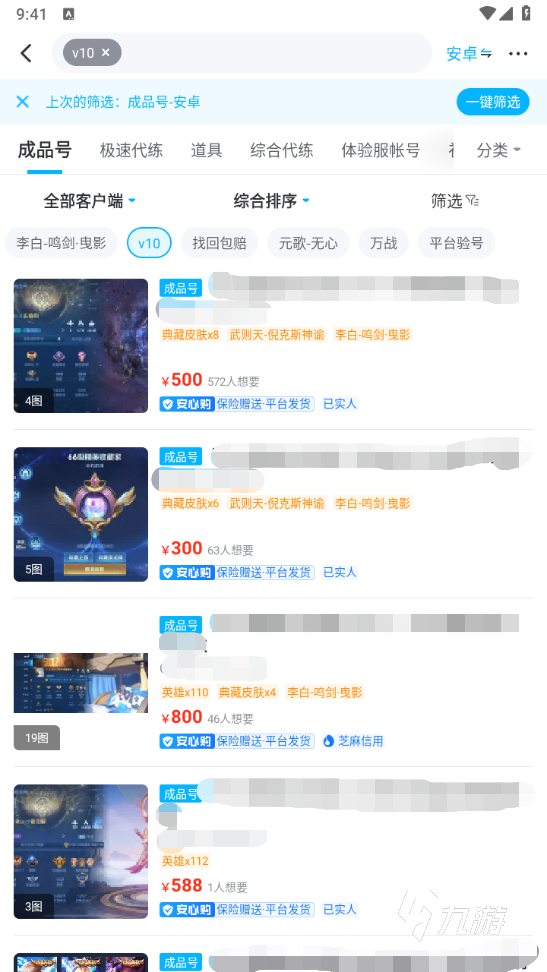 一頁都顯示不完,而且在交易貓搜索這款游戲,下面自帶的標識里就有“v10”,大家甚至可以不用費勁的去點右上角篩選,直接點輸入框下方的標識就能見到成堆的v10號了。
