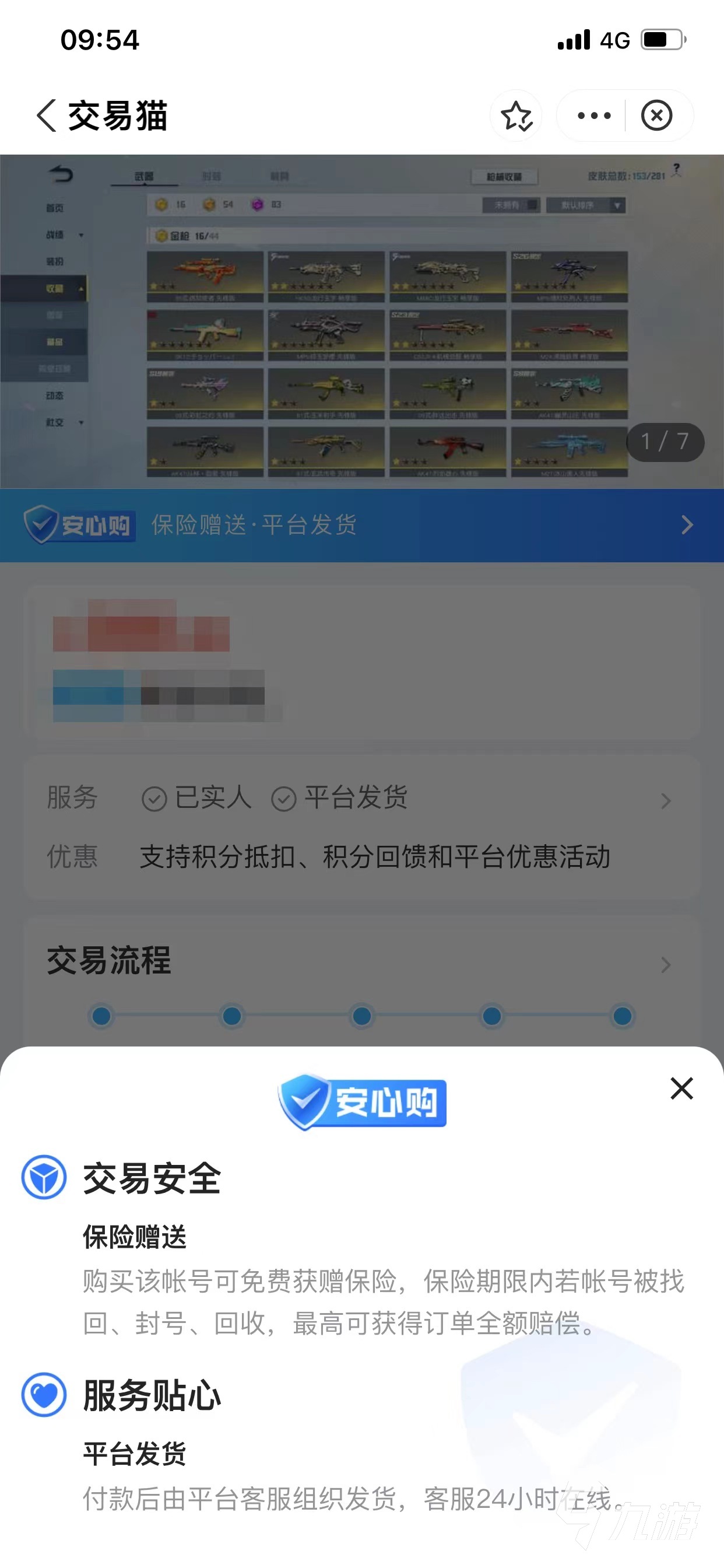 交易過程也是交易貓最關注的一點,在買家拍下賬號后,就可以直接進入到在線發(fā)貨界面了,有24小時在線的官方職業(yè)客服全程護航,步驟清晰簡單。擔心游戲賬號被找回的玩家還可以選擇帶有安心購服務的賬號,如圖片所示,部分帶有安心購的賬號被購買后就能免費獲贈保險,在保險期內不再擔心被找回了!