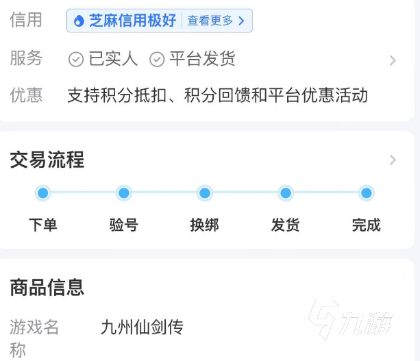 九州仙劍傳這款游戲,在交易貓里面進行交易的時候,玩家點開其商品的信息,就會發(fā)現(xiàn),它除了有芝麻信用積分的綁定以外,還提供了平臺發(fā)貨的服務(wù),當(dāng)然交易流程也是清晰透明,下單到完成,每一個步驟都在這里顯示了出來,這么做的目的就是為了防止出現(xiàn)意外,導(dǎo)致交易失敗,或者用戶利益受損,同時也有去享受平臺的優(yōu)惠回饋活動哦。