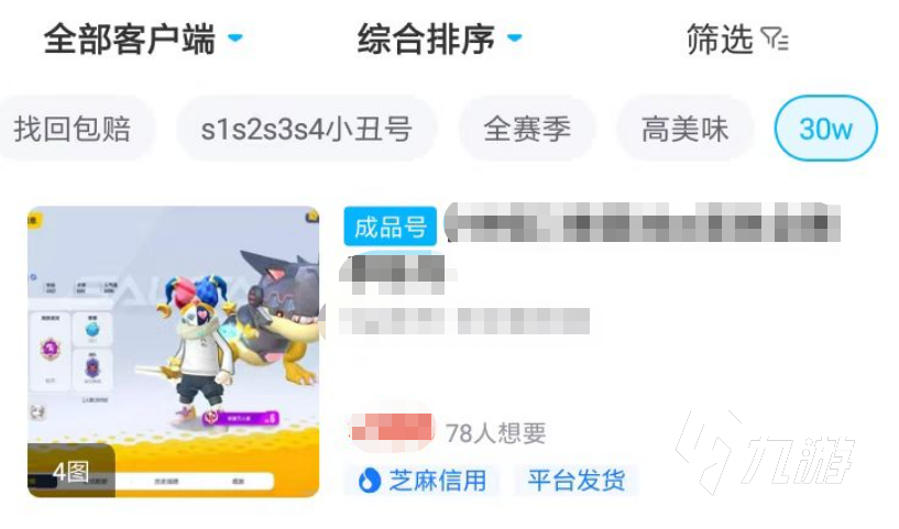 1、剛進入交易貓內(nèi)開始篩選香腸派對游戲號的時候,大家會發(fā)現(xiàn)很多基礎(chǔ)賬號的交易信息也在其中,為了讓土豪號的交易信息更精準的得到展現(xiàn),建議大家在專區(qū)內(nèi)選擇全賽季和30W的這兩個標簽,符合這兩個條件的賬號,就是大家所關(guān)注的土豪游戲號。