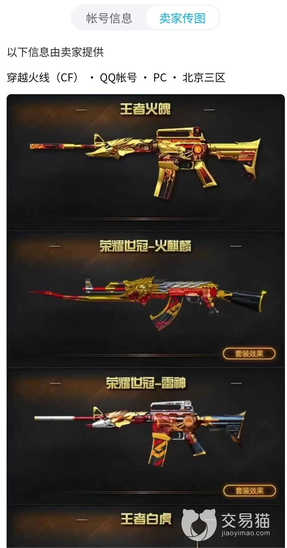 買家若是看到感興趣的穿越火線優(yōu)質(zhì)賬號,還可以點擊進這個商品賬號里面去查看,里面有很多賣家放上的商品信息圖,能夠很清晰的看到這個穿越火線游戲賬號里究竟有哪些裝備資源,哪些時裝,哪些槍等等。基本上都很清晰的展示給了賣家,也是打開天窗說亮話,看上了就可以帶走。
