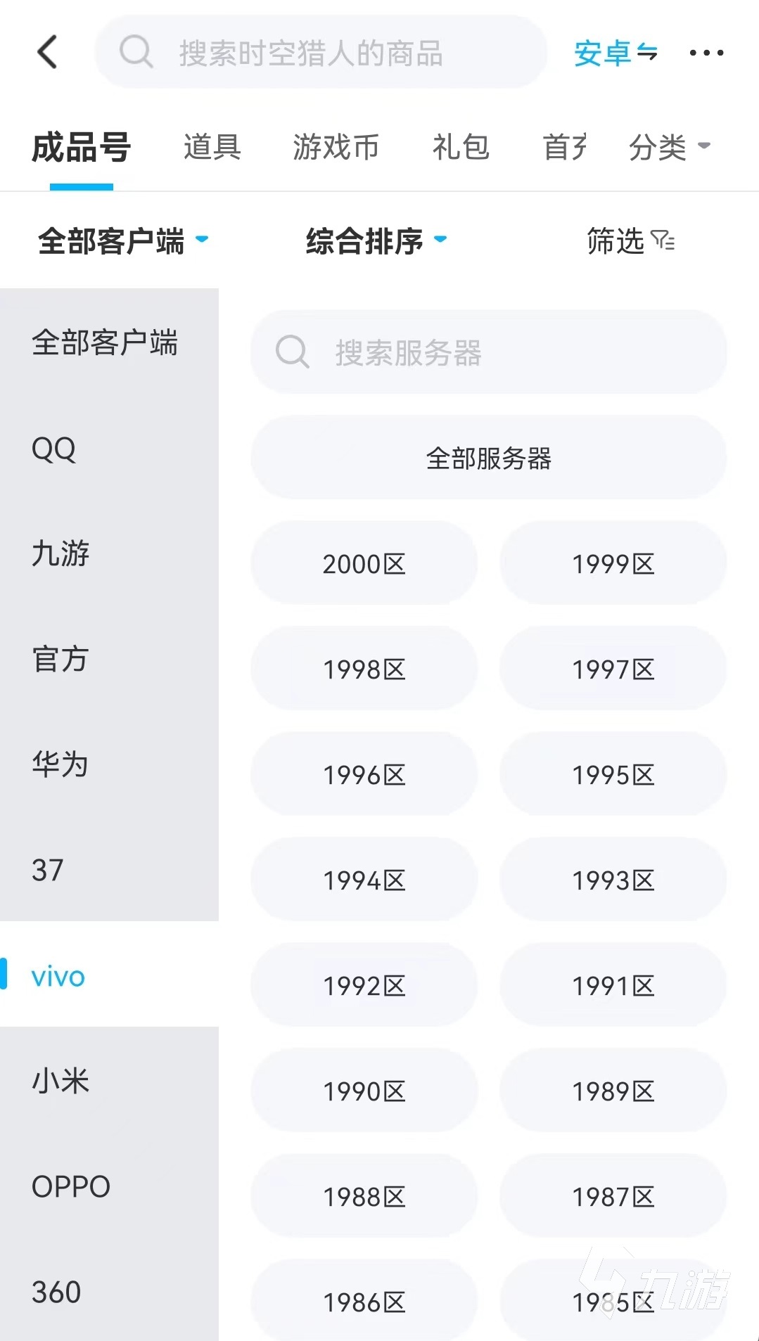 想要在這里買(mǎi)到自己心儀的賬號(hào)非常簡(jiǎn)單,因?yàn)樘峁┝嗽敿?xì)的篩選功能,通過(guò)填寫(xiě)理想中的角色等級(jí),職業(yè),VIP等級(jí)和戰(zhàn)力指數(shù)等,就可以將符合要求的商品快速篩選出來(lái)。當(dāng)然此時(shí)找到的是全部客戶端的內(nèi)容,為了在其中將vivo平臺(tái)的找出來(lái),可以在全部客戶端中選擇vivo,然后可以看到所有vivo旗下的服務(wù)器。如果沒(méi)有特殊需求,那么直接點(diǎn)擊全部就可以了。接下來(lái)就是在逐個(gè)查看,最終鎖定要購(gòu)買(mǎi)的那一個(gè)。