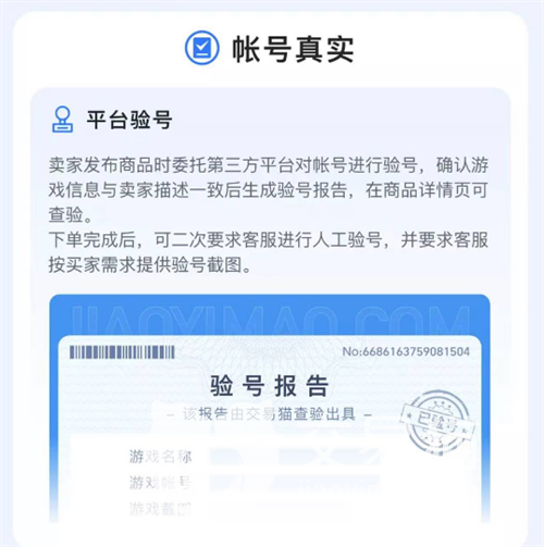考慮到賬號交易的特殊性,雙方都很關(guān)注驗貨的過程,尤其是對于購買者來說尤為重要,如果在交易完成后發(fā)現(xiàn)不符合要求,后續(xù)的維權(quán)會十分麻煩,因此交易貓在一開始挑選商品時,讓用戶就可去選擇帶有驗號標簽的商品,這些賬號在上架后,經(jīng)過平臺的驗號后,能夠確保與描述相符,除了可靠外也能讓用戶安心,同時在下單后還可要求進行二次驗號,通過多重保障來確保用戶所收到的商品確實符合需求。