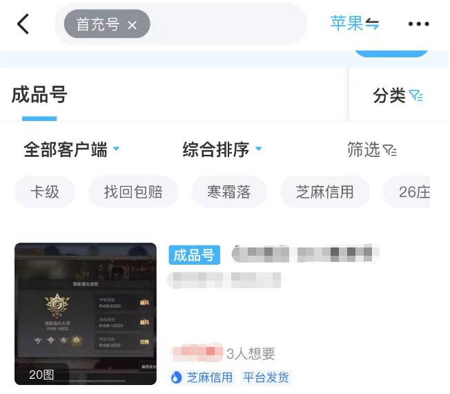 其實小編之所以會推薦大家選擇交易貓,一個主要的原因就是它能讓用戶去自由的選購賬號,首充號就是其中之一,而小平臺里面先不說賬號的類型匱乏,首充號的性價比也是很低,但是它不同,除了有設(shè)立專區(qū)以外,直接搜索也可以去看到類似的游戲賬號,當然成品號的種類也是相當?shù)呢S富,包括智能的綜合排序功能,讓高性價比游戲號一目了然,比如芝麻信用或者是卡級號等,都能在這里通過熱搜詞來點擊進入哦。