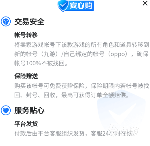 平臺里的大部分賬號都是提供了安心購服務(wù)的,有這些服務(wù)的賬號在購買時可以享受對應(yīng)的服務(wù),其中包括部分端口的“賬號轉(zhuǎn)移”,有這種標識的賬號可省去換綁過程,直接將賣家賬號的物品轉(zhuǎn)移到您的號上,從而大大降低風險。另外,大多數(shù)的安心購還會贈送保險,這個是免費的,相當于一份錢買了兩套服務(wù),既得到了優(yōu)質(zhì)的發(fā)貨客服,又得到了保障安全的保險。