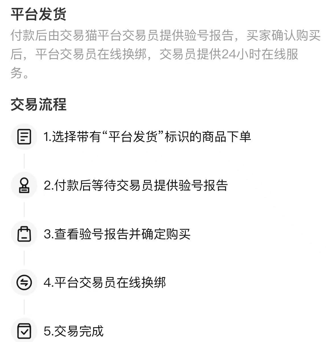 同時交易貓還給打造安全放心的交易環(huán)境,不僅有安全中心隨時處理違規(guī)舉報,還有平臺發(fā)貨交易模式提高交易的安全性。選擇平臺發(fā)貨以后買家就跟平臺進行賬號交易,無論是驗號還是資料轉(zhuǎn)移都是由平臺專業(yè)的人員完成了,買家就不用擔心交易的過程中被騙或者是買到假的賬號了。