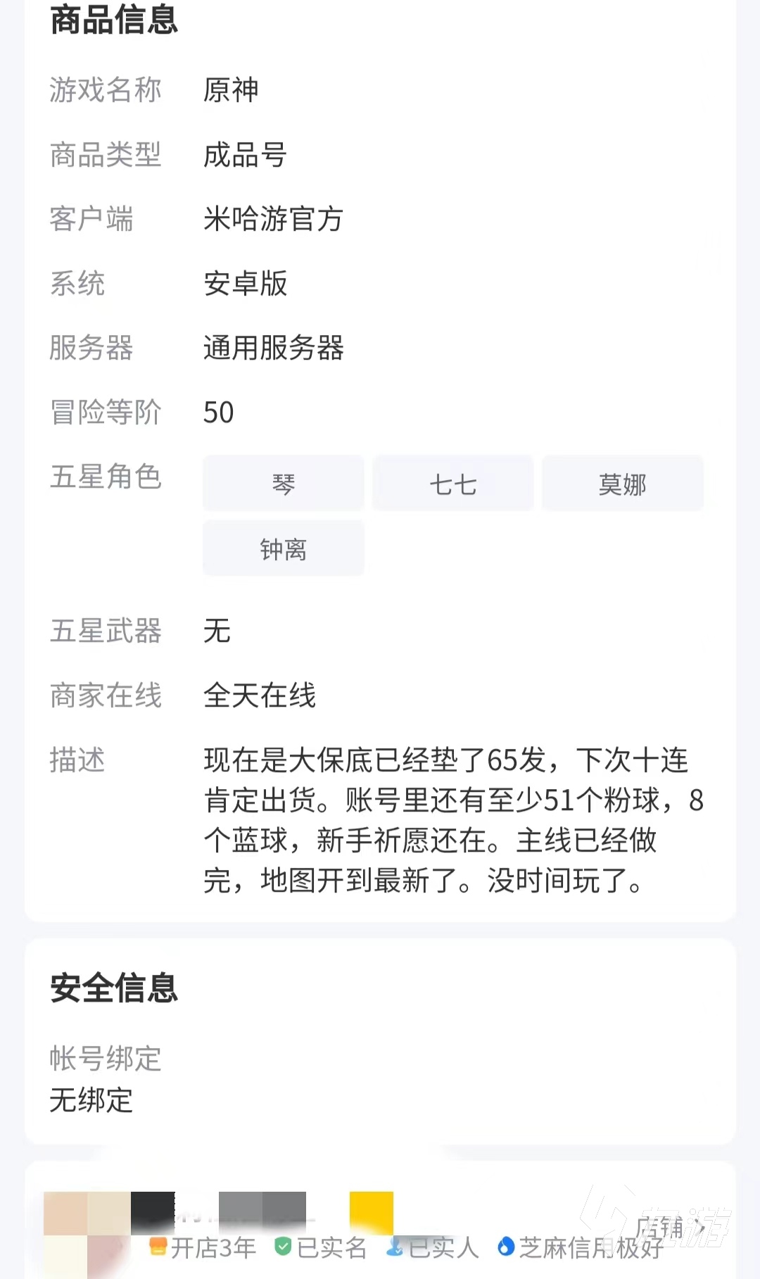 篩選完賬號后,點擊查看詳細信息,可以確定賬號是否有自己需要的五星角色和五星武器,角色幾命,冒險等級等內(nèi)容,下方還有賣家的詳細描述如賣家實名認證,芝麻信用認證,是否是注冊了誠信賣家,近30天內(nèi)的成交率其他買家的好評率等等。