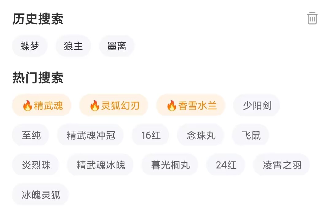了解該游戲的基本上都是沖著賬號內的紅色皮膚數(shù)量,所以有交易貓要求商家在填寫賬號信息的時候介紹一下自己的紅皮個數(shù),更方便買家做出對比和選擇。但是如果是該游戲的小白沒有接觸過這個游戲,那就可以在熱門搜索詞條里面可以看到:靈狐幻刃、少陽劍、香雪水蘭還有精舞魂沖冠之類的,這些都是交易貓的其他用戶在近幾日熱搜的相關詞條,可以作為大家選購賬號的參考依據(jù)。