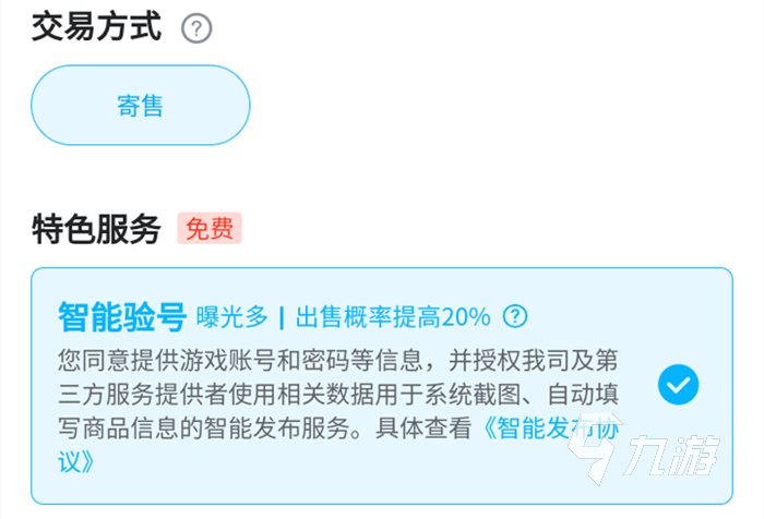 其實在估值完成之后,如果大家準(zhǔn)備將自己的號賣出去,是可以點擊下方一鍵發(fā)布的,這樣的話在上架的過程中就不需要重復(fù)填寫剛才的那些資源和內(nèi)容了。這里提醒一下大家,和平精英這款游戲的賬號上架是支持免費的平臺驗號服務(wù)的,強烈建議大家勾選上。通過平臺驗號,能夠自動完成商品的鑒定,并且為我們出示專屬的報告和標(biāo)識,大幅提高我們商品的曝光率和成交幾率,對賣家來說是一個很好的貼心服務(wù)。