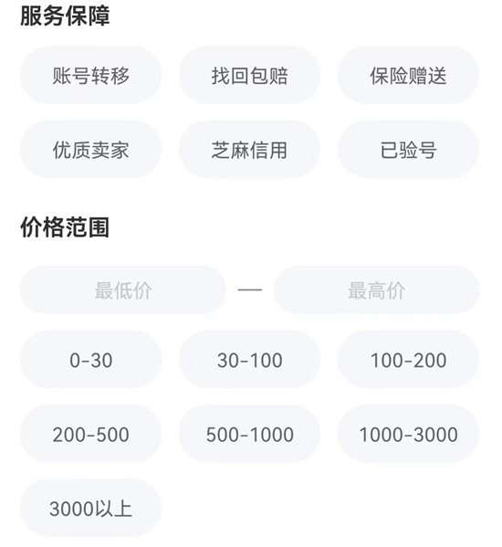接下來就是極高的性價比也讓交易貓在全網(wǎng)備受好評,我們在挑選自己想要的賬號時候可以通過篩選功能來完成。我們可以選擇自己想要的服務(wù)保障,還有價格范圍,這樣就可以快速找到我們想要的游戲賬號了。從下圖我們也可以看到光是服務(wù)保障交易貓就有6種,所以小伙伴們也不用擔(dān)心交易安全的問題。用交易貓購買賬號就是這么的清晰明了、簡單粗暴。