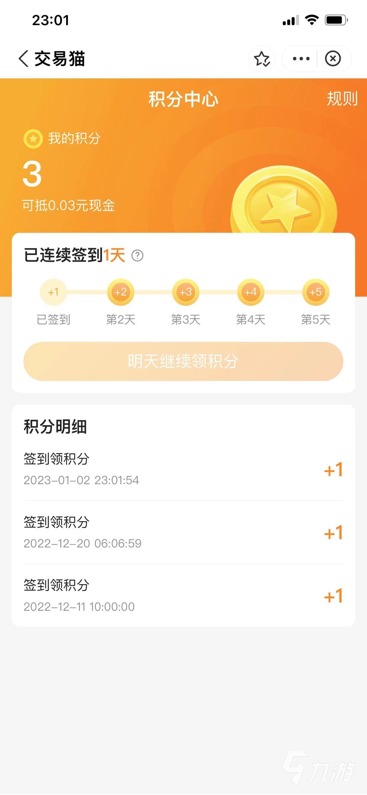 交易貓平臺(tái)的大部分商品都是支持積分抵扣現(xiàn)金的,那怎么才能獲取到大量的積分呢?首先最簡(jiǎn)單的就是每日的簽到活動(dòng),一定注意的是連續(xù)簽到才能得到更多的積分,小伙伴們不要忘記哦。還有在購買商品時(shí),也可以返還一定比例的賬號(hào),具體詳情可以在平臺(tái)積分規(guī)定中進(jìn)行查看。