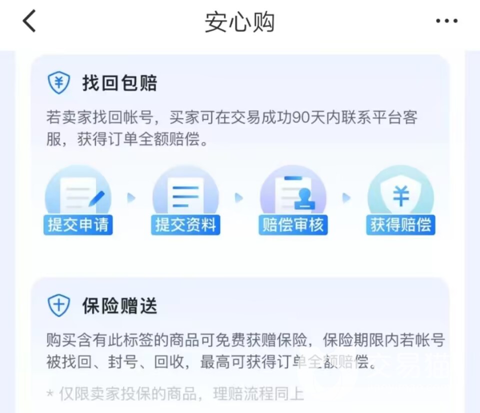 最后就是大家都很關心的售后問題了,在交易貓只要你在交易后的72小時內發(fā)現(xiàn)賬號有任何問題,或者之后號主在交易之后又把號找了回去,可以在交易貓上申請賠償平臺會全額返還交易金的,這也是小編推薦交易貓的一個主要原因。