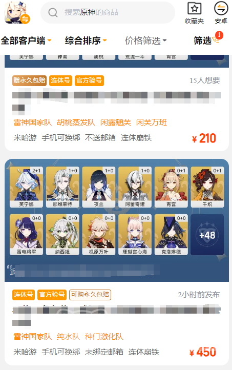 有些朋友想要買米哈游賬號,肯定是因?yàn)橄胍淮涡匀胧侄鄠€游戲號。例如米哈游旗下的原神以及絕區(qū)零,你能在這買到包含著多個游戲的連體號。這樣你就能一次性獲得多個米哈游游戲號,然后又能盡情暢玩。如此所需要花費(fèi)的價格也更低,畢竟都是一起打包賣掉的。