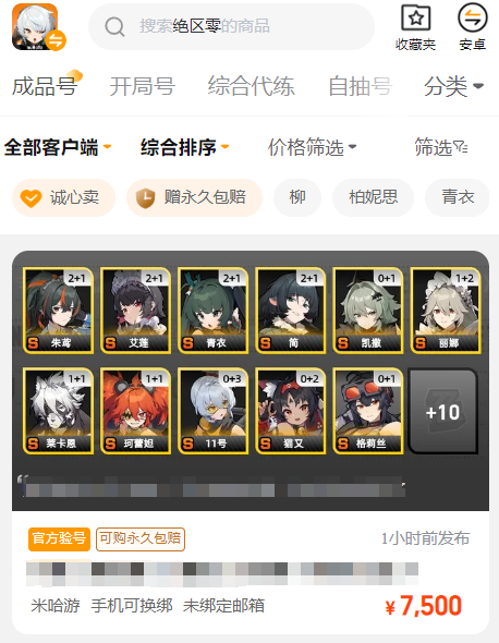 當(dāng)然米哈游的游戲號肯定多種多樣,包括成品的崩鐵或者原神號,又或者初始的絕區(qū)零、原神自抽號。都能在這兒見到,這樣就能滿足不同需求的買家。他們都能按照自己的心意獲取自己需要的號,避免浪費(fèi)過多的錢。