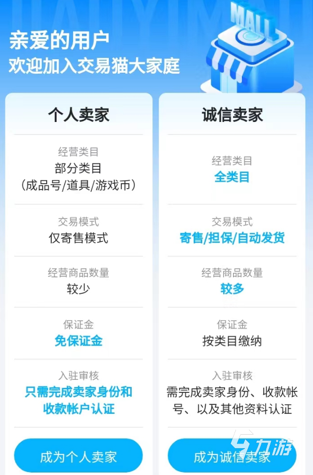 了解到了平臺(tái)可以輕松幫助大家進(jìn)行各類賬號(hào)出售時(shí),玩家們的下一步就是去開通一個(gè)賣家身份了。目前針對(duì)普通用戶最劃算的就是個(gè)人賣家,此身份的申請(qǐng)流程簡(jiǎn)單,支持的商品類型也包含了游戲號(hào),符合大家的使用條件。而對(duì)于誠(chéng)信賣家來(lái)說(shuō),當(dāng)各位打算將其作為一個(gè)職業(yè)的時(shí)候,在考慮申請(qǐng)也不遲。