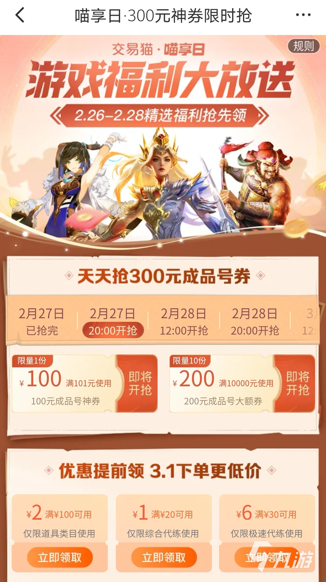 平臺會不定時的推出一些活動,能夠讓大家得到一些優(yōu)惠券,這樣在喵享日時就可以使用這些優(yōu)惠券去購買游戲賬號了,相比原先的價格來說可能會更低,這樣不僅能夠讓自己購買到賬號還能節(jié)省一大筆費用,兩全其美的事情何樂而不為呢?