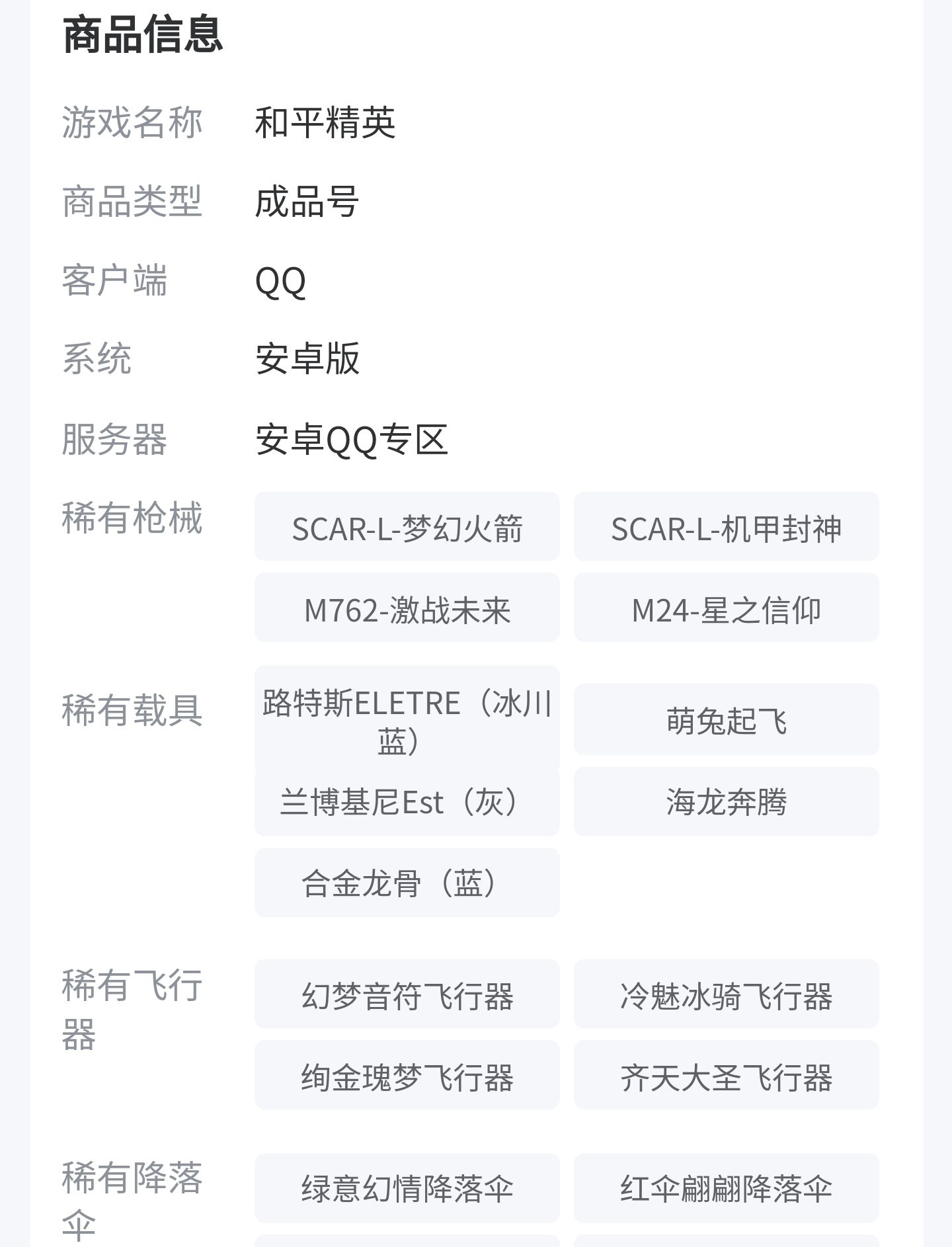 除了在驗號報告中會為大家展示平臺官方親自出具的相關(guān)截圖之外,大家就是在界面里查看有什么稀有槍械載具等等,這都是商家根據(jù)自己的賬號情況來真實描述的,甚至連QQ的綁定情況都會不落下的給大家,當(dāng)然這種游戲大家最擔(dān)心的還是是否為成人認(rèn)證賬號,否則的話否則的話每天只能玩一個小時可真不行,專業(yè)的驗號員都會給大家數(shù)據(jù)報告的時候重點(diǎn)提一下。