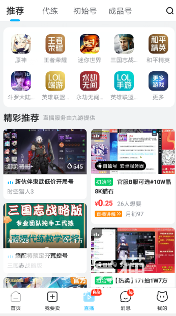 1、獨(dú)特的直播交易,可以讓用戶們更直觀的去了解到每一個(gè)商品的具體信息。交易貓app為玩家們提供了直播交易的專區(qū),各位可以在線進(jìn)入到直播間當(dāng)中,就可以獲取到豐富的商品交易信息。該功能最大的優(yōu)勢(shì)就在于,各位玩家可以更直觀的看到每一個(gè)高級(jí)賬號(hào)在游戲當(dāng)中具體的表現(xiàn),從而下定決心進(jìn)行購買。