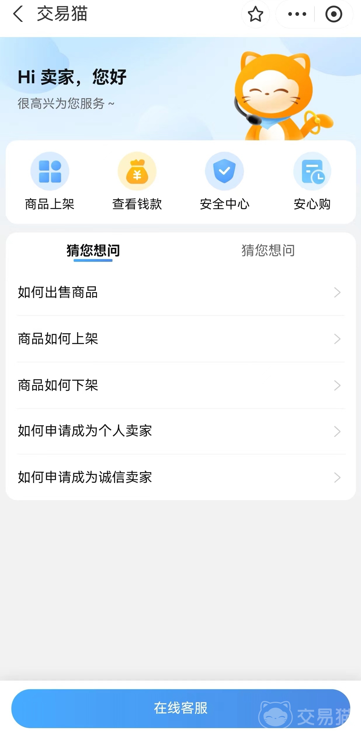 在大家上架游戲賬號和出售游戲賬號的過程中有任何不懂的問題都可以去咨詢客服,客服都是24小時全天在線為大家解疑答惑提供優(yōu)質(zhì)服務(wù)的,比如你不知道游戲賬號如何上架和如何出售游戲賬號等問題都可以在頁面當(dāng)中找到對應(yīng)的板塊,點(diǎn)擊進(jìn)入之后就可以看到結(jié)果和對應(yīng)的答案了,如果板塊當(dāng)中沒有你想提問的問題就可以直接點(diǎn)擊在線客服,像安心購、查看錢款、和安全中心等等的板塊都有。