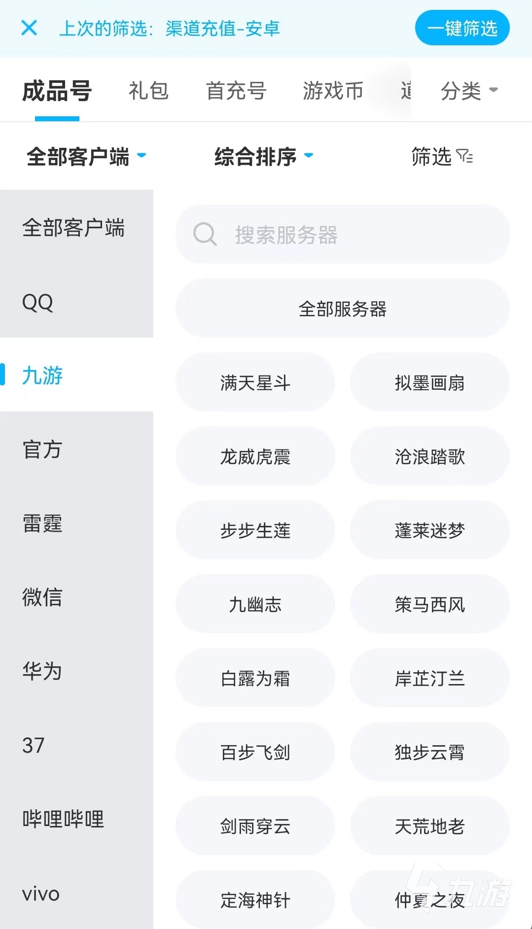 在購(gòu)買賬號(hào)方面可以非常輕松的找到符合自己要求的內(nèi)容,可以進(jìn)行的選項(xiàng)包括有交易類型,所在客戶端等。交易類型指的是可以在這里購(gòu)買成品號(hào),首充號(hào),禮包,游戲幣等不同的內(nèi)容,這些都可以作為商品直接出售。而很多玩家為了和好朋友們?cè)谝黄鹩螒?,往往在?gòu)買賬號(hào)的時(shí)候需要指定客戶端,這一點(diǎn)也可以在平臺(tái)中非常輕松的實(shí)現(xiàn),無(wú)論是官方服務(wù)器還是九游,雷霆,華為等熱門渠道服,在這里都有出售選項(xiàng)。