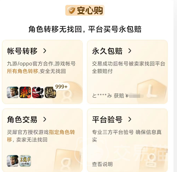 要是你曾經(jīng)打開過交易貓的話,應(yīng)該會留意到在主頁宣傳的“安心購”服務(wù),與其說這是一份保險,不如說這是一份對買家的保障,因為它是由平臺直接進行贈予的,不過這項服務(wù)也只是在部分賬號當(dāng)中才有體現(xiàn),這其中就包含了很多安全政策,也有大家最為關(guān)注的找回包賠項目,還有一些合作的平臺提供的賬號轉(zhuǎn)移服務(wù),總之只要是你能想到的安全服務(wù),在安心購里面基本都能體現(xiàn)出來。