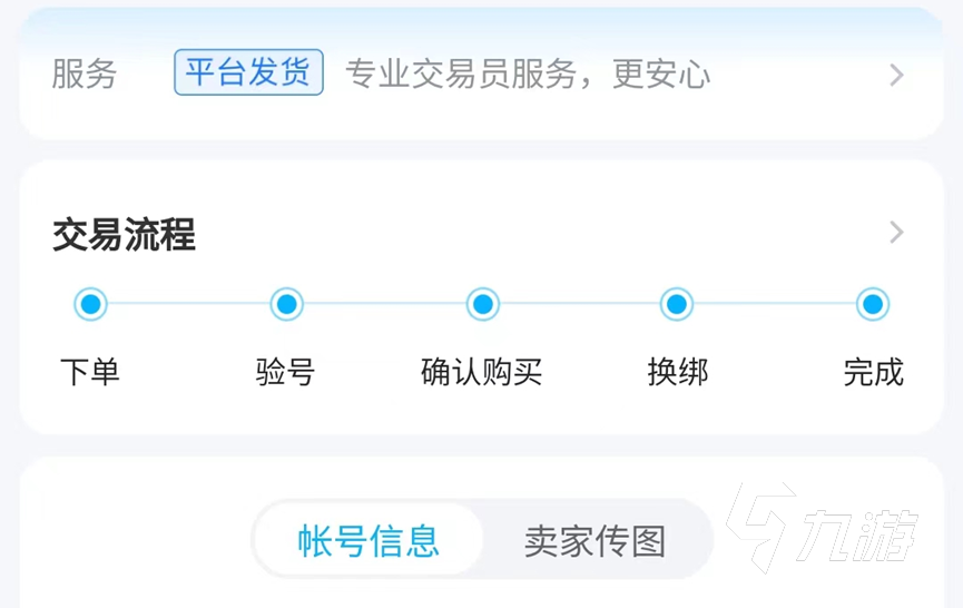 賣(mài)家可以在商品的詳情頁(yè)面很清楚的看到賬號(hào)的基本情況,像賬號(hào)是不是由平臺(tái)發(fā)貨,賬號(hào)的基本信息,還可以點(diǎn)擊賣(mài)家上傳的賬號(hào)圖片進(jìn)行一個(gè)提前的賬號(hào)體驗(yàn),交易流程也是很清楚的顯示在頁(yè)面。