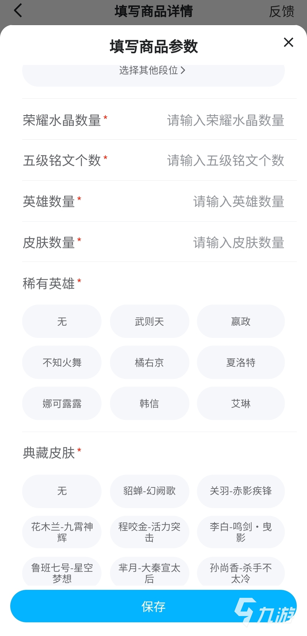 有了定價以后,上架前還有一步那就是介紹賬號。小編上文也提到了,王者榮耀各方面的參數(shù)比較復(fù)雜,如果沒有一個模板,賣家要全面介紹賬號還是得耗費不少編寫時間的?而交易貓已經(jīng)為賣家準(zhǔn)備了專門的介紹頁面,比如皮膚、英雄、段位,賣家只需用手指點一點就行了。