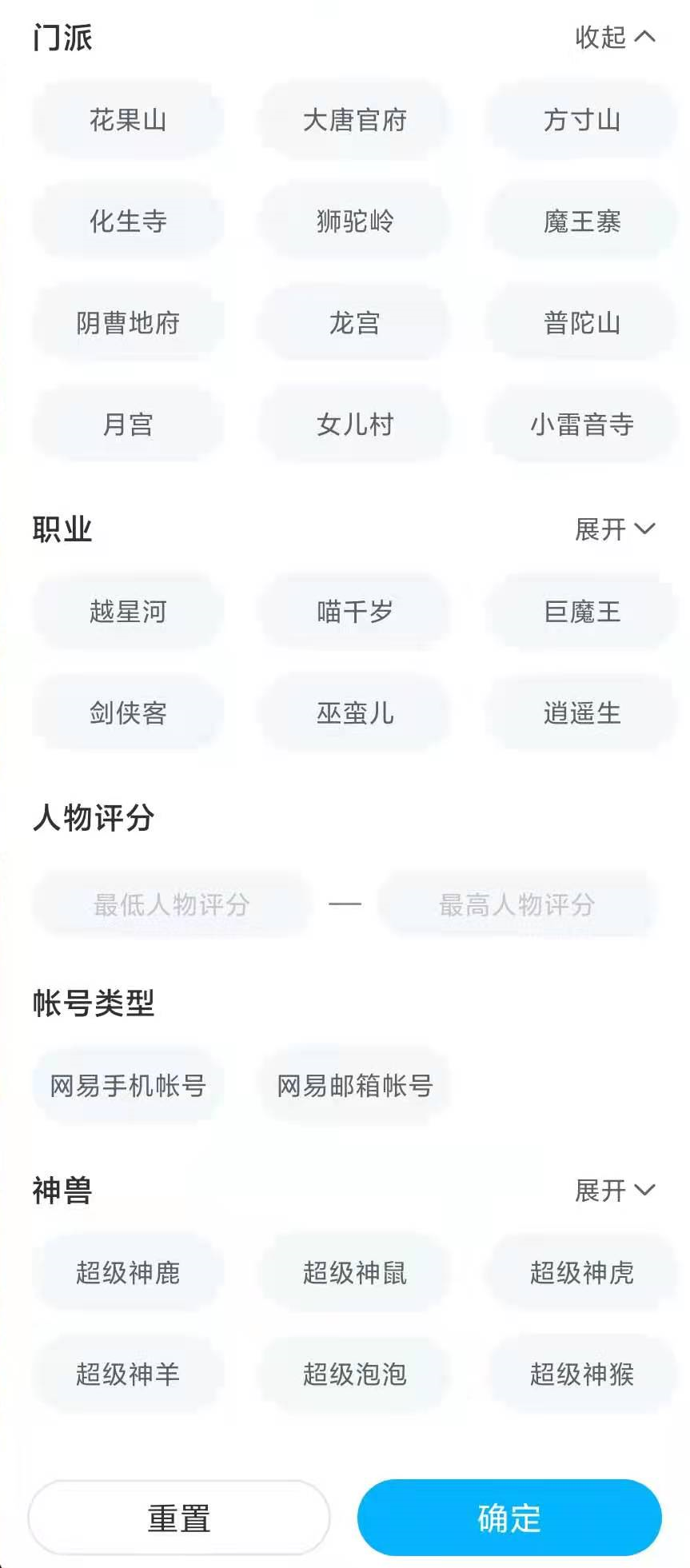 不同玩家玩游戲所追求的大有不同,有的喜歡物理戰(zhàn)士,有的喜歡法師奶媽。由于夢幻西游手游中有著十二門派和三個種族十九個職業(yè),在交易貓海量賬號一頁一頁翻過于麻煩。便利篩選的一眾詞條,像熱賣的大唐官府龍?zhí)印⒎酱缟絼b客等門派職業(yè)詞條,按你的喜好搭配,還有人物評分、神獸等內(nèi)容來篩選。