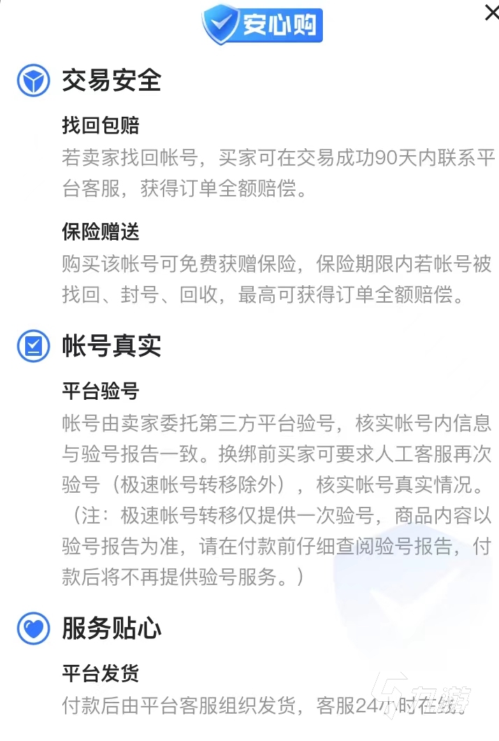 大家在交易去吧皮卡丘賬號的時候,最關心的是什么?無疑是安全保障,在交易貓平臺上有非常完善的服務體系,用戶的安全有保障。大家在商品詳情頁的上方可以看到安心購服務,但是需要注意的是并不是所有的商品都滿足條件,只有部分的商品有此項服務,其中就安心購部分服務中就包括找回包賠、保險贈送等,大家可以自行查看,建議大家優(yōu)先選擇有安心購服務的商品,更靠譜。