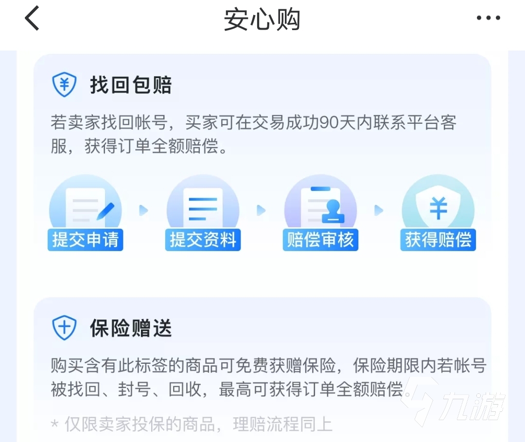 所以小編比較推薦各位選擇帶有安購標(biāo)識的商品,這是由于加入安心購的商品,有找回包賠服務(wù),還會有保險附贈,如果保險期限內(nèi)賬號有被找回、封號、回收等狀況,可獲得不同金額的賠付。