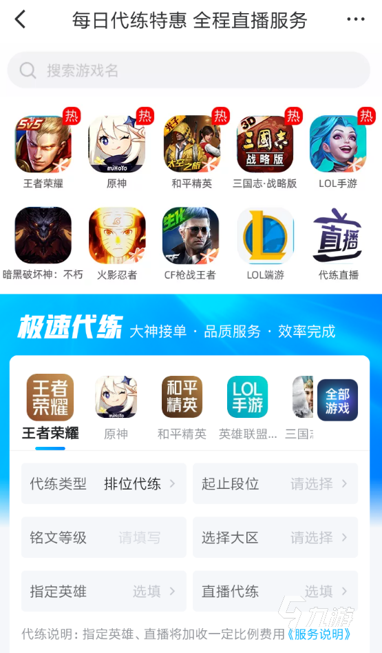 3、交易貓將不僅僅支持玩家們出售自己的九游賬號,平臺內(nèi)甚至為大家開放了代練專區(qū),在這里各位可以尋找自己滿意的代練大神。讓這些大神們幫助玩家去完成游戲內(nèi)的各種挑戰(zhàn),非常適合平時游戲時間較少的玩家來進行下單。
