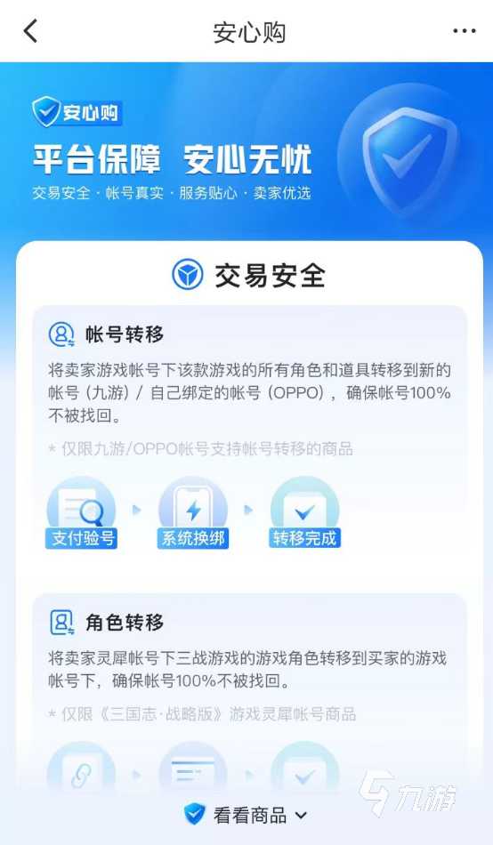 1、當(dāng)然,在選擇游戲號(hào)的過(guò)程當(dāng)中,玩家們也會(huì)開(kāi)始關(guān)心交易是否安全的問(wèn)題。各位對(duì)交易安全水準(zhǔn)要求較高的玩家,建議直接去購(gòu)買部分擁有安心購(gòu)這一服務(wù)保障的商品。此類商品最大的優(yōu)勢(shì)在于,得到平臺(tái)保障的同時(shí)還會(huì)在出現(xiàn)任何意外的情況下對(duì)玩家進(jìn)行賠償。