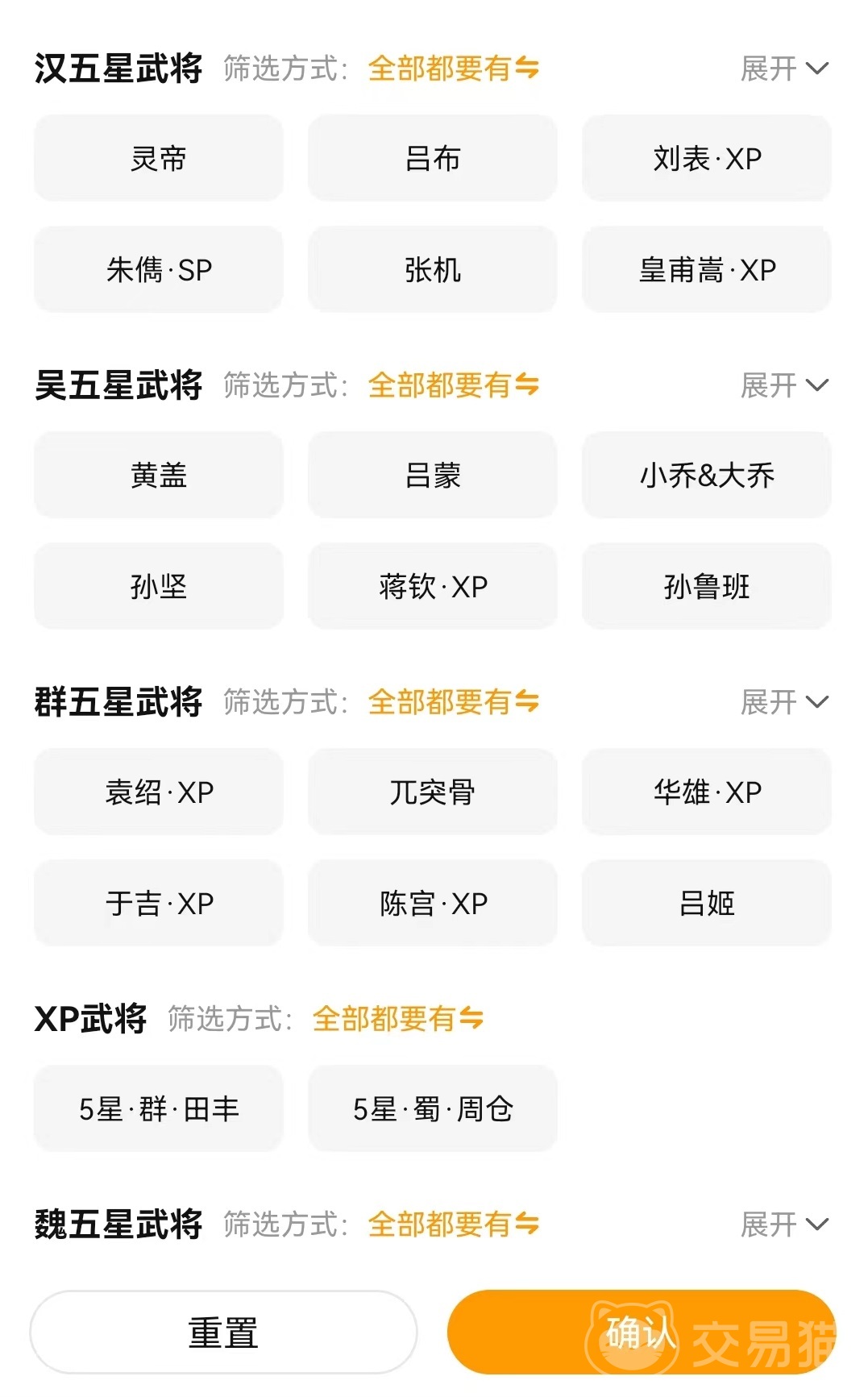 為了方便大家在眾多商品中快速選擇自己喜歡的內(nèi)容,提供了很詳細(xì)的篩選選項(xiàng),根據(jù)游戲特點(diǎn)可以直接通過帳號中所擁有的5星武將來進(jìn)行選擇。只需要在其中將自己心儀武將選擇出來,就會自動完成篩選,再通過價格排序和其他方面選擇,快速鎖定性價比最高的內(nèi)容。這樣即使平臺中擁有眾多賬號內(nèi)容,也不用浪費(fèi)大家的時間去逐個查看,選擇會方便很多。
