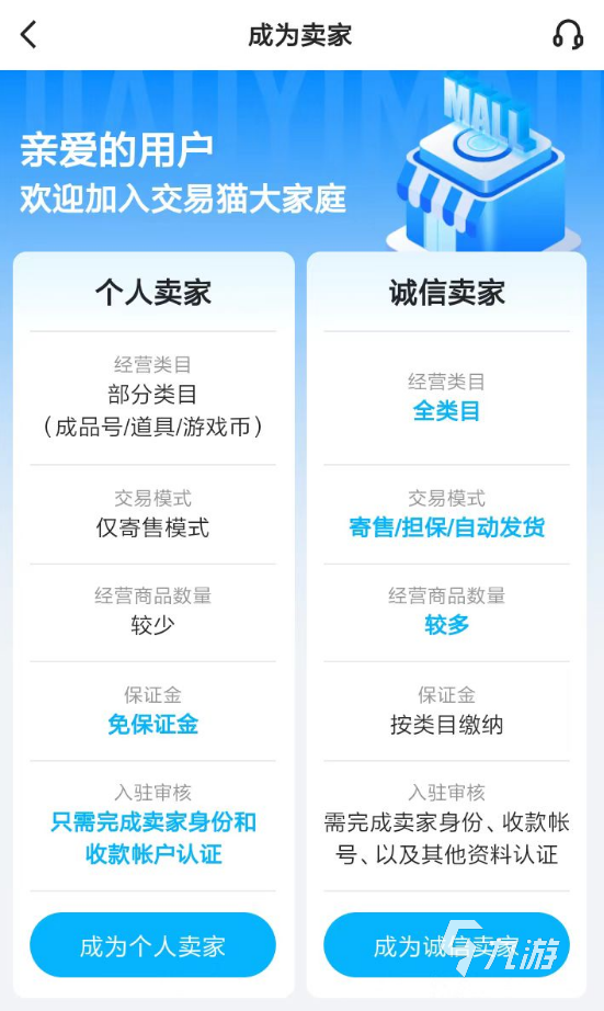 3、為了方便那些想要進(jìn)行賬號(hào)出售的玩家,交易貓也為各位準(zhǔn)備了成為賣(mài)家的通道。申請(qǐng)的流程十分簡(jiǎn)單,按照要求進(jìn)行身份驗(yàn)證即可。適合個(gè)人或者職業(yè)玩家入駐,交易貓內(nèi)部的大量活躍用戶(hù),也將持續(xù)幫助正在處理賬號(hào)的玩家們得到不錯(cuò)的商品曝光,提高各位處理商品的效率。