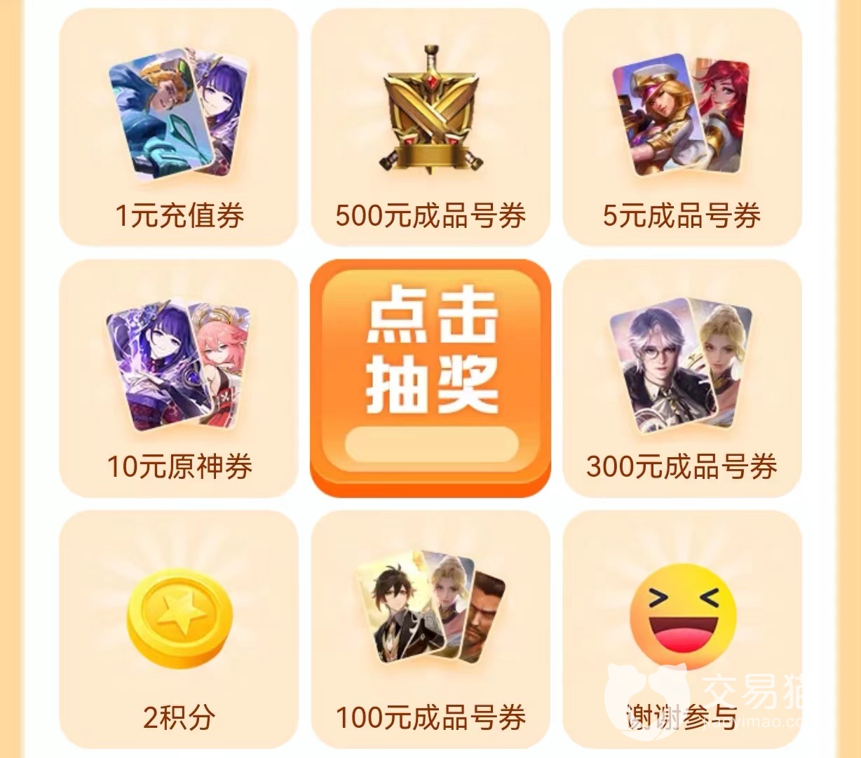 平臺為了彰顯性價比還有另一種手段,就是推出各種活動,官方自己組織的活動會發(fā)放各種優(yōu)惠券,可以直接在下單時候抵扣,優(yōu)惠券的面值不同,小的幾十大的幾百,全靠用戶的手速和運氣去搶。每位用戶都可以在交易貓簽到領取積分,積分可以直接用于下單抵扣金額,雖然數(shù)量很少,但是蚊子腿也是肉。而積分還有個用處,就是用于卡池抽獎,要是能拿到大獎就賺翻了。