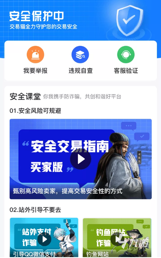 3、為了進(jìn)一步加強(qiáng)玩家對(duì)于交易安全的放心程度,交易貓app當(dāng)也直接開啟了安全保護(hù)功能,大家可以一邊通過視頻內(nèi)容來提升自己的安全知識(shí),同時(shí)也可以在安全中心內(nèi)舉報(bào)各種涉嫌虛假描述的商品。