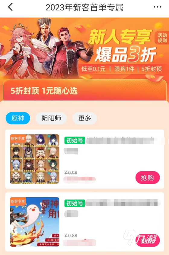 3、當(dāng)然,為了友好的迎接每一位新加入的玩家,平臺都會不定時的開展各種迎新活動。玩家可以在新客頁面當(dāng)中,挑選到其他熱門游戲的賬號。因為活動的原因,這些賬號的出售價格往往也非常的便宜。