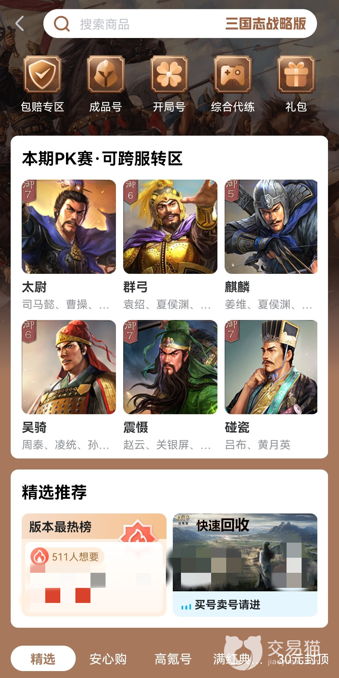 交易貓中的賬號商品雖然多,但是有詳細的分類,所以在查找起來也很方便。熱門游戲都有自己對應的專區(qū),在專區(qū)中還會進一步劃分,例如在三國志戰(zhàn)略版中就有不同陣容的詳細劃分。能夠選擇自己喜歡的英雄組成的陣容。還擁有高氪號、滿紅號以及新上架等多項分類。其他熱門游戲中也是如此,根據(jù)自己的特點進行進一步分區(qū)。